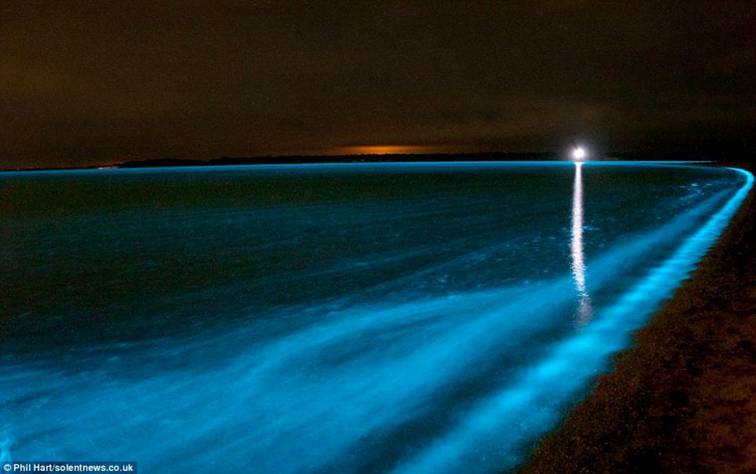 Lago Gipslend, Australia (la reacción química llamada bioluminiscencia torna el agua de color azul fluorescente